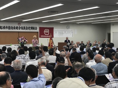 「船橋市自治会連合協議会定期総会」は、船橋市内877ある自治会、町内会の長たちが集まる会合で、今回は300人ほどの参加者がありました。